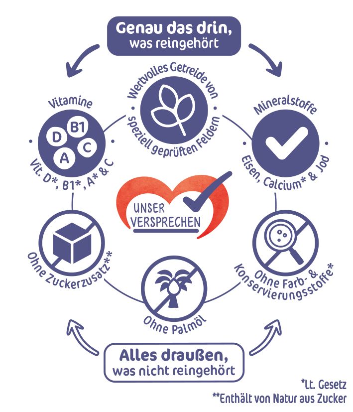 Für dein Baby ist ein erholsamer Schlaf für einen guten Start am nächsten Tag wichtig. Unser Gute Nacht Butterkeks ist auf die Bedürfnisse von Babys nach dem 6. Monat abgestimmt und enthält neben wertvollem Getreide von speziell geprüften Feldern das Gute aus der Milch. Damit liefert unser Milchbrei Vitamine und Mineralstoffe, wie Eisen, Calcium und Vitamin D und begleitet die natürliche Entwicklung deines Kindes - Schritt für Schritt. Unser Milchbrei ist lecker, frei von Konservierungs- und Farbstoffen (laut Gesetz) & ohne Zuckerzusatz**. Einfach mit Wasser zubereiten - ideal für die letze Mahlzeit am Abend.