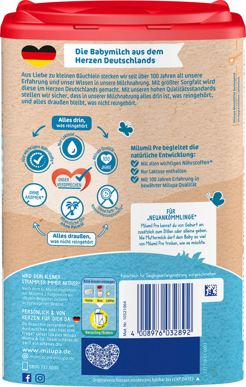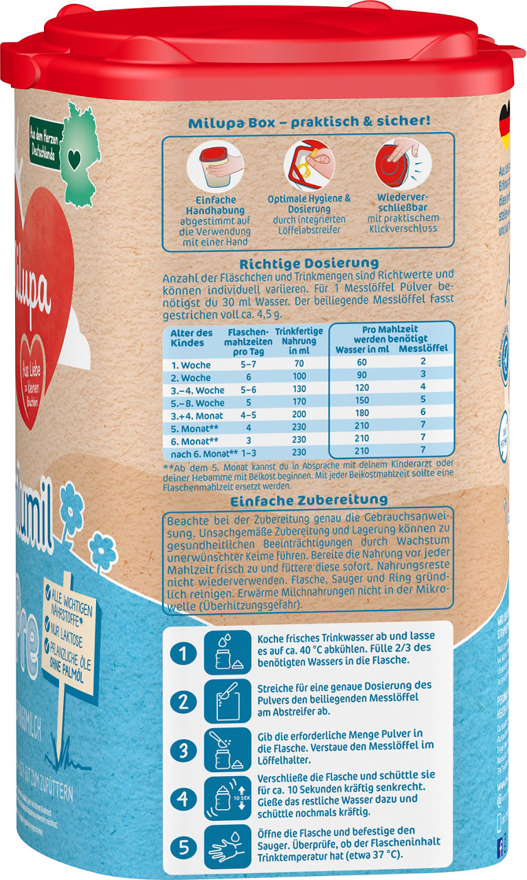 Aus Liebe zu kleinen Bäuchlein steckt Milupa seit über 100 Jahren all seine Erfahrung und sein Wissen in die Milupa Babymilch. Mit größter Sorgfalt und viel Liebe wird diese im Herzen Deutschlands gemacht. Dadurch entstehen möglichst kurze Transportwege für einen geringeren CO2-Fußabdruck.