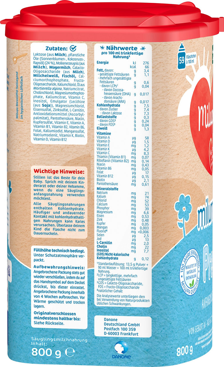 Laktose (aus Milch), pflanzliche Öle (Sonnenblumen-, Kokosnuss-, Rapsöl) (24%), Molkenerzeugnis (aus Milch), Magermilch, Galactooligosaccharide (aus Milch), Molkeneiweiß (aus Milch), Fischöl, Calciumorthophosphat, Fructooligosaccharide, Kaliumchlorid, Öl aus Mortierella alpina, Natriumcitrat, Cholinchlorid, Magnesiumorthophosphat, Kaliumcitrat, Vitamin C, Inositol, Emulgator (Sojalecithin), Magnesiumchlorid, Eisen-II-sulfat, Zinksulfat, L-Carnitin, Antioxidationsmittel (Ascorbylpalmitat), Pantothensäure, Niacin, Kupfersulfat, Vitamin E, Vitamin A, Vitamin B1, Vitamin B2, Vitamin B6, Folsäure, Kaliumjodid, Mangan-II-sulfat, Natriumselenit, Vitamin K, Biotin, Vitamin D, Vitamin B12